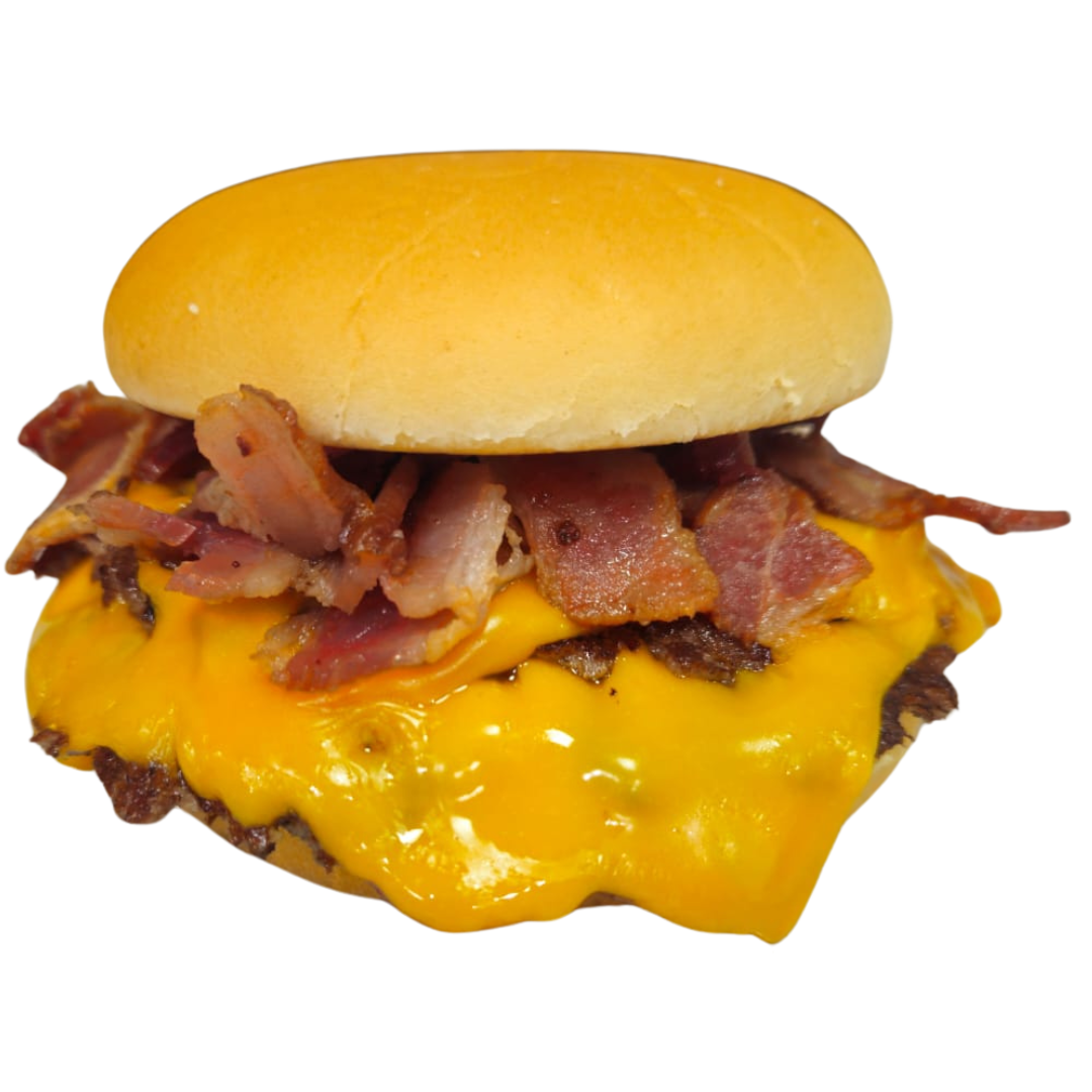 Pão, dois burgers, muito cheddar e bacon.